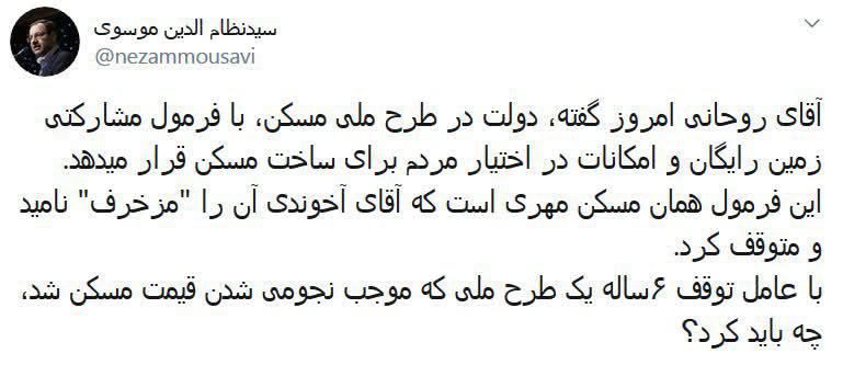 سید نظام الدین موسوی مدیرعامل سابق خبرگزاری فارس در صفحه شخصی خود در توییتر به صحبت‌های روحانی درباره طرح ملی مسکن واکنش نشان داده است.