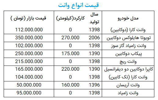 به گزارش جهان نیوز، براساس مشاهدات میدانی، قیمت انوع خودرو وانتدر بازار آزاد به شرح زیر است: