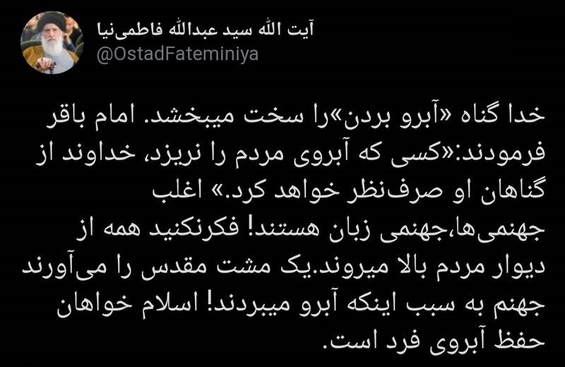صفحه توییتری منتسب به آیت الله فاطمی نیا نوشت: خدا گناه «آبرو بردن» را سخت می‌بخشد. امام باقر فرمودند: «کسی که آبروی مردم را نریزد، خداوند از گناهان او صرف‌نظر خواهد کرد.» اغلب جهنمی‌ها، جهنمی زبان هستند! فکرنکنید همه از دیوار مردم بالا می‌روند. یک مشت مقدس را می‌آورند جهنم به سبب اینکه آبرو میبردند! اسلام خواهان حفظ آبروی فرد است.