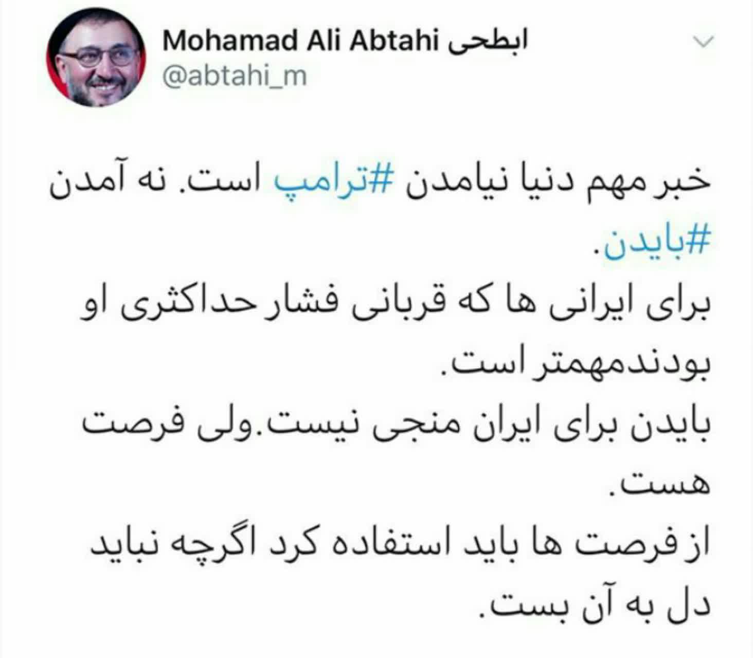 محمد علی ابطحی رئیس دولت اصلاحات با انتشار توییتی مدعی شد که باید از فرصت بایدن استفاده کنیم، اصلاح طلبان این روزها از انتخاب بایدن خیلی خوشحال هستند.