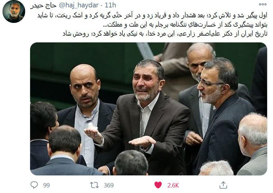 یکی از کاربران توییتر در صفحه شخصی خود به درگذشت دکتر علیاصغر زارعی نماینده ادوار مجلس شورای اسلامی و مشاور رئیس جمهور در دولت نهم، واکنش نشان داده است.