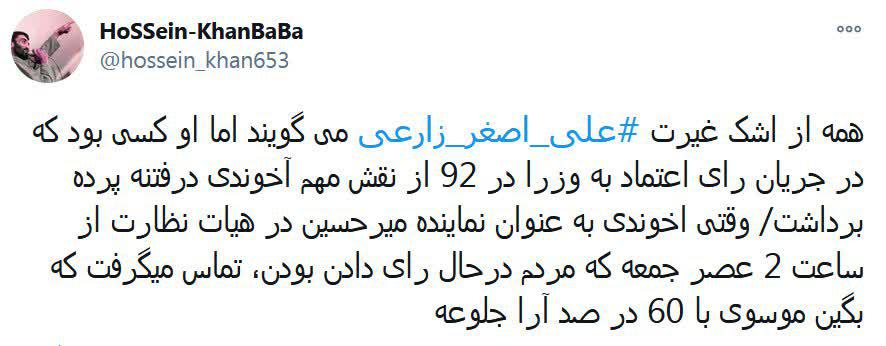 یکی از کاربران توییتر در صفحه شخصی خود به نقش پر رنگ دکتر علیاصغر زارعی در افشای نقش آخوندی در ایجاد فتنه ۸۸ اشاره کرده است.