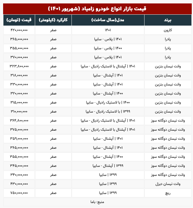 به گزارش جهان نیوز، قیمت پادرا مدل ۱۴۰۱ به ۳۶۵ میلیون رسید که نسبت به دو هفته گذشته ۸ میلیون ارزان شده است. قیمت وانت نیسان دوگانه سوز مدل ۱۴۰۱ به ۳۶۱ میلیون رسید. همچنین وانت نیسان بنزین سال ۹۹ به ۳۱۰ میلیون رسیده است که نسبت به دو هفته گذشته ۱۴ میلیون ارزان شده است. وانت نیسان دیزل مدل ۹۹ نیز به ۴۳۰ میلیون تومان رسید که به معنای افزایش ۵ میلیونی طی هفته گذشته است. منبع : اقتصاد آنلاین