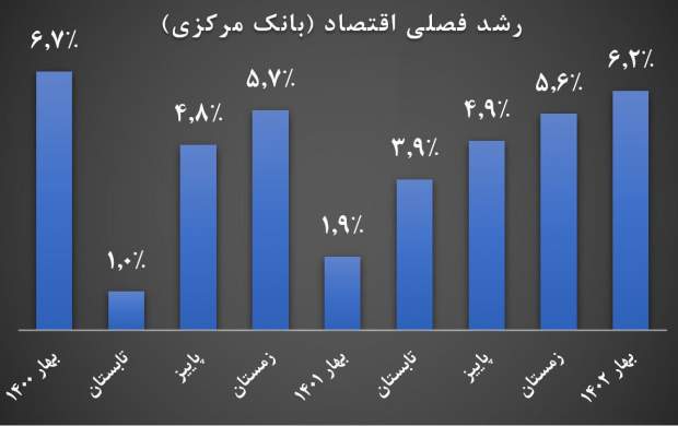 شایان ذکر است رشد مثبت تولید ناخالص داخلی در فصل اول سال ۱۴۰۲ در تداوم رشد اقتصادی مثبت محقق شده از فصل اول سال ۱۳۹۹ تا فصل چهارم سال ۱۴۰۱ بوده است؛ به نحوی که میزان رشد اقتصادی کشور در فصول سال ۱۴۰۱ به ترتیب برابر با یک و 9 دهم، سه و 9 دهم، چهار و 9 دهم و پنج و سه دهم درصد بوده است.