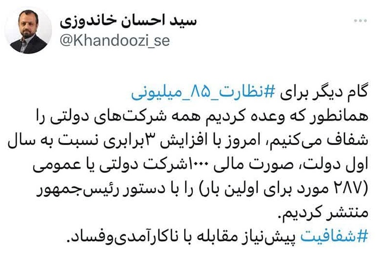 وزیر اقتصاد با انتشار توئیتی در شبکه اجتماعی ایکس از انتشار صورتهای مالی ۱۰۰۰ شرکت دولتی به دستور رئیسجمهور در سامانه کدال خبر داد.