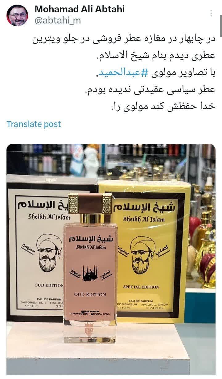 محمد علی ابطحی در صفحه شخصی خود در توییتر با تصویری به عطر شیخ الاسلام اشاره کرده است.
