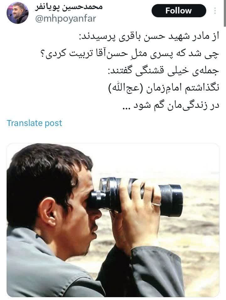 محمد حسین پویانفر مداح اهل بیت(ع) در توییتی به صحبت های مادر شهید حسن باقری در مورد تربیت این شهید عزیز اشاره کرده است.