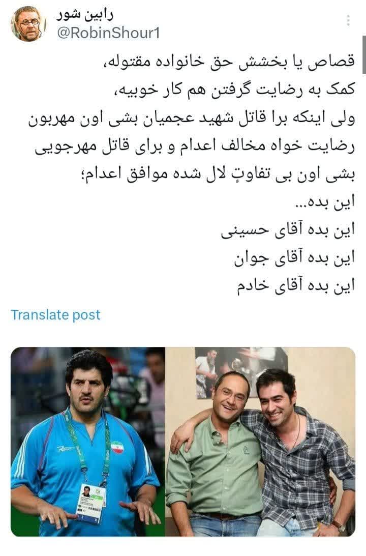 کمک به رضایت گرفتن کار خوبی است ولی اینکه برای قاتل شهید عجمیان بشوی آن مهربان رضایت خواه مخالف اعدام و برای قاتل مهرجویی بشوی آن بی تفاوت لال شده موافق اعدام این بد است.