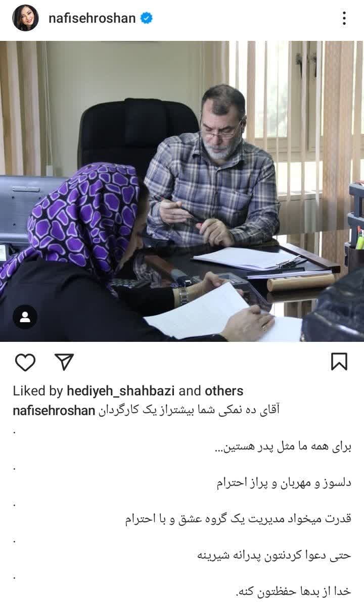 نفیسه روشن با انتشار یک پست در صفحه اینستاگرام خود، ارادتش به مسعود دهنمکی را اعلام کرد.