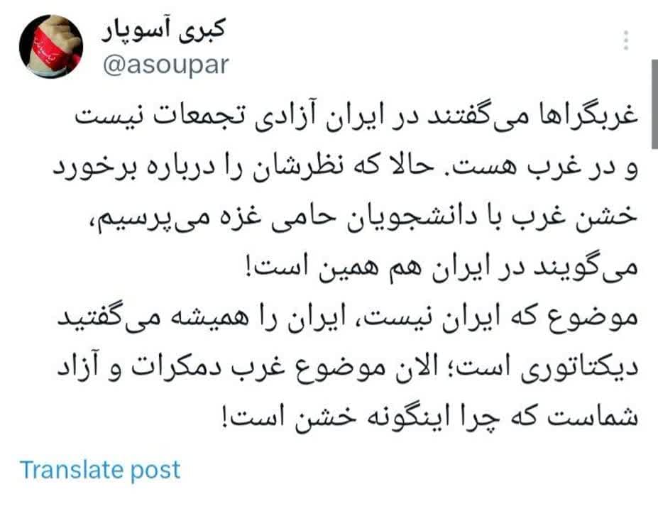 موضوع که ایران نیست، ایران را همیشه می گفتید دیکتاتوری است؛ الان موضوع غرب دموکرات و آزاد شماست که چرا اینگونه خشن است.