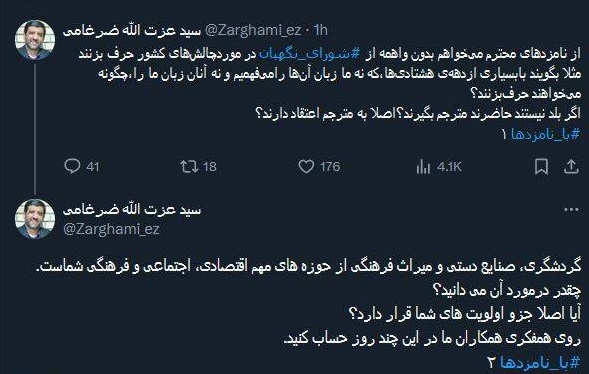 ضرغامی، وزیر میراث فرهنگی و گردشگری در توئیتی نوشت: از نامزدهای محترم میخواهم بدون واهمه از شورای نگهبان در موردچالشهای کشور حرف بزنند.