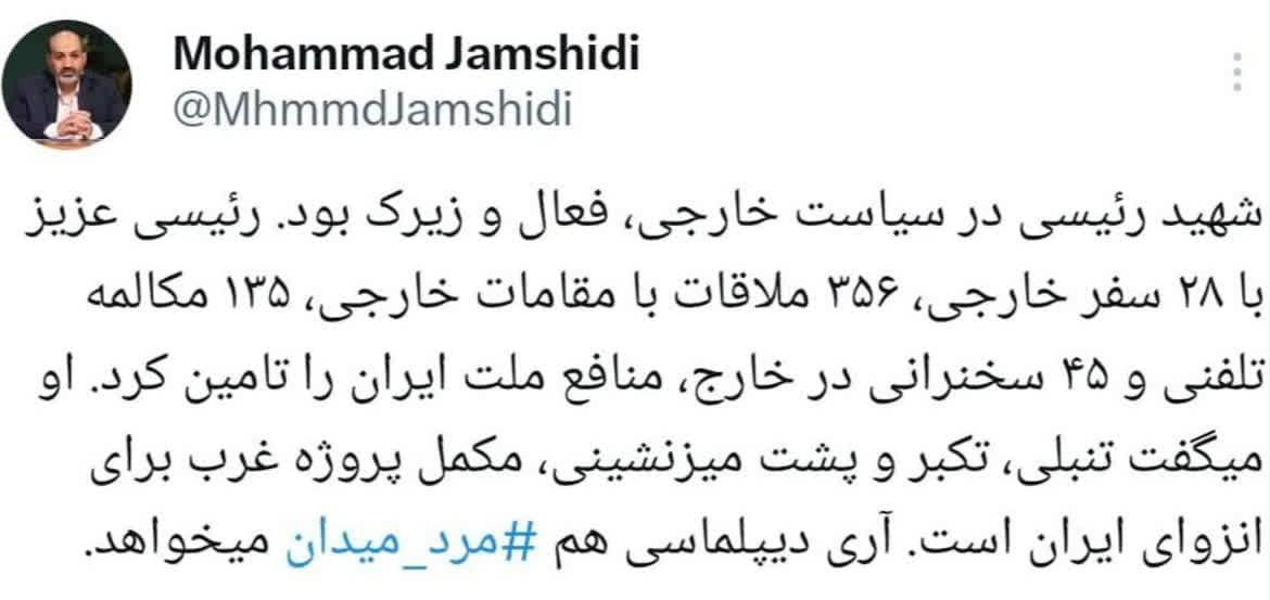 رئیسی عزیز با ٣۵۶ ملاقات با مقامات خارجی، ١٣۵ مکالمه تلفنی و ۴۵ سخنرانی در خارج، منافع ملت ایران را تامین کرد.