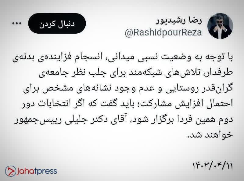چه رئیس جمهور جلیلی شود یا خیر رشید پور تویی ساکت وبشین سرجات...