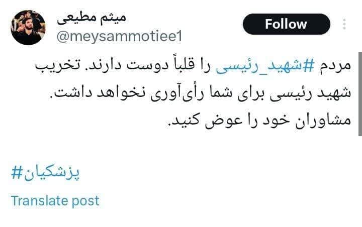مردم شهید رئیسی را قلبا دوست دارند تخریب شهید رئیسی برای شما رای آوری نخواهد داشت.