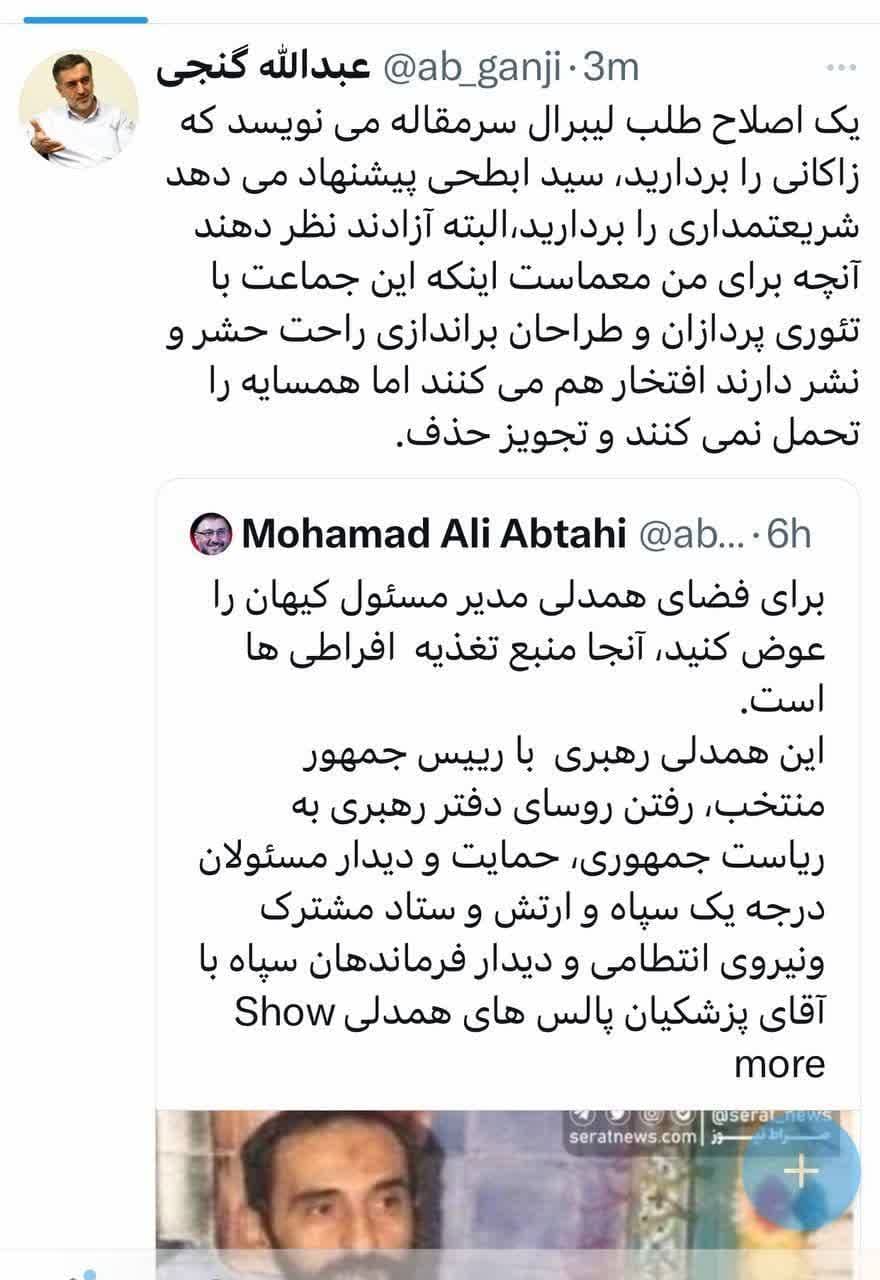 یک اصلاح طلب لیبرال سر مقاله می نویسد که زاکانی را برردارید سید ابطحی پیشنهاد می دهد شریعتمداری را بردارید.