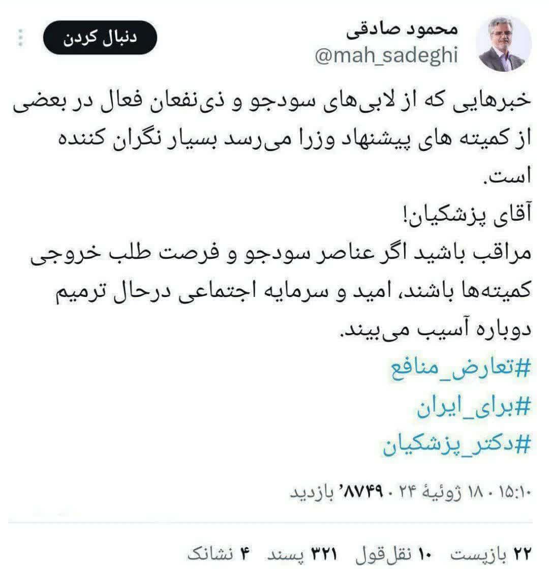 لابی های سنگین افراد سودجو برای چینش کابینه صدای محمود صادقی را هم درآورد!