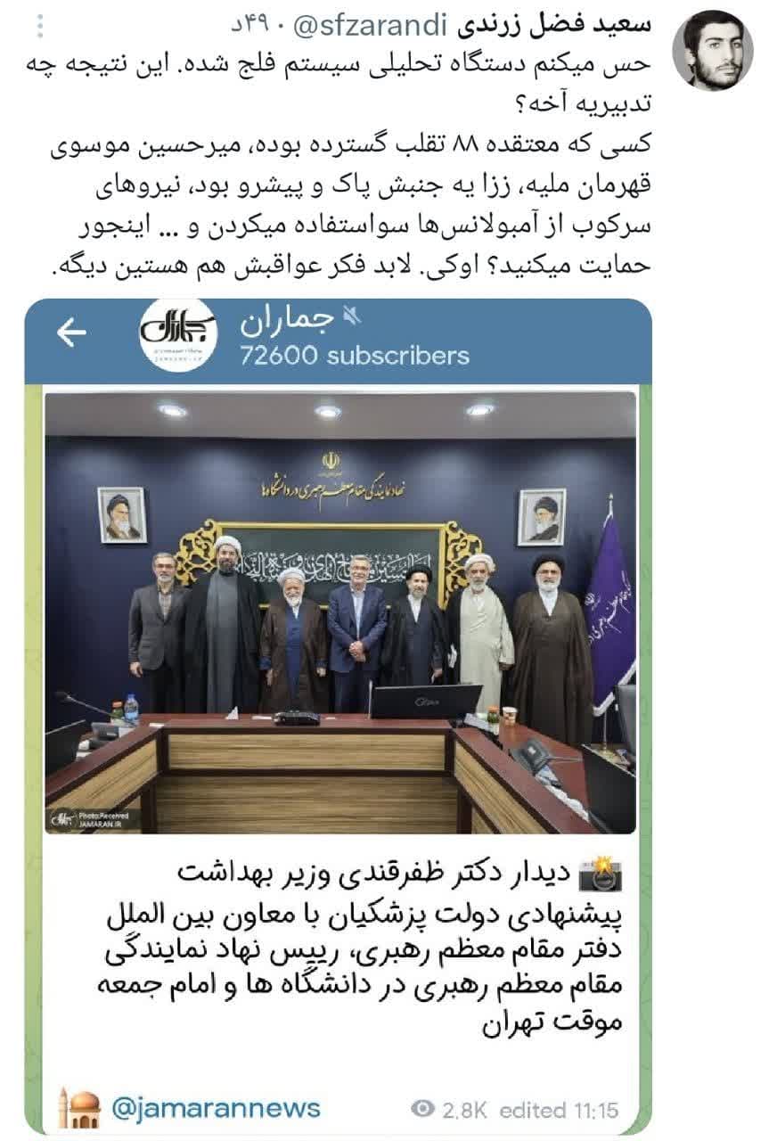 خشم کاربران از دیدار نماینده رهبری با ظفرقندی گزینه پیشنهادی وزارت بهداشت.