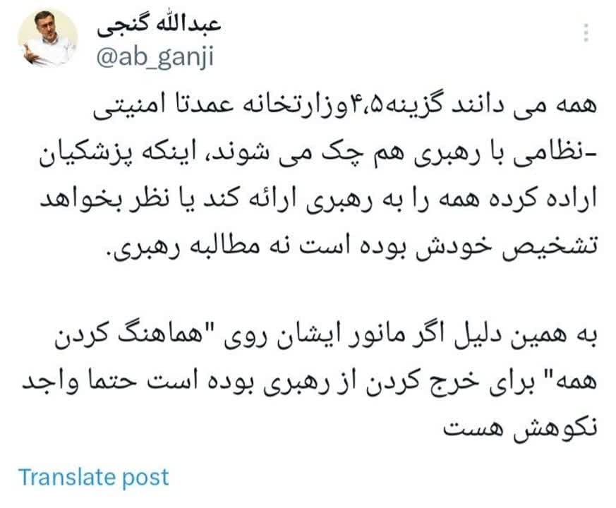 توییت عبدالله گنجی در مورد حرکت پزشکیان در جلسه رای اعتماد وزرای پیشنهادی در مجلس.