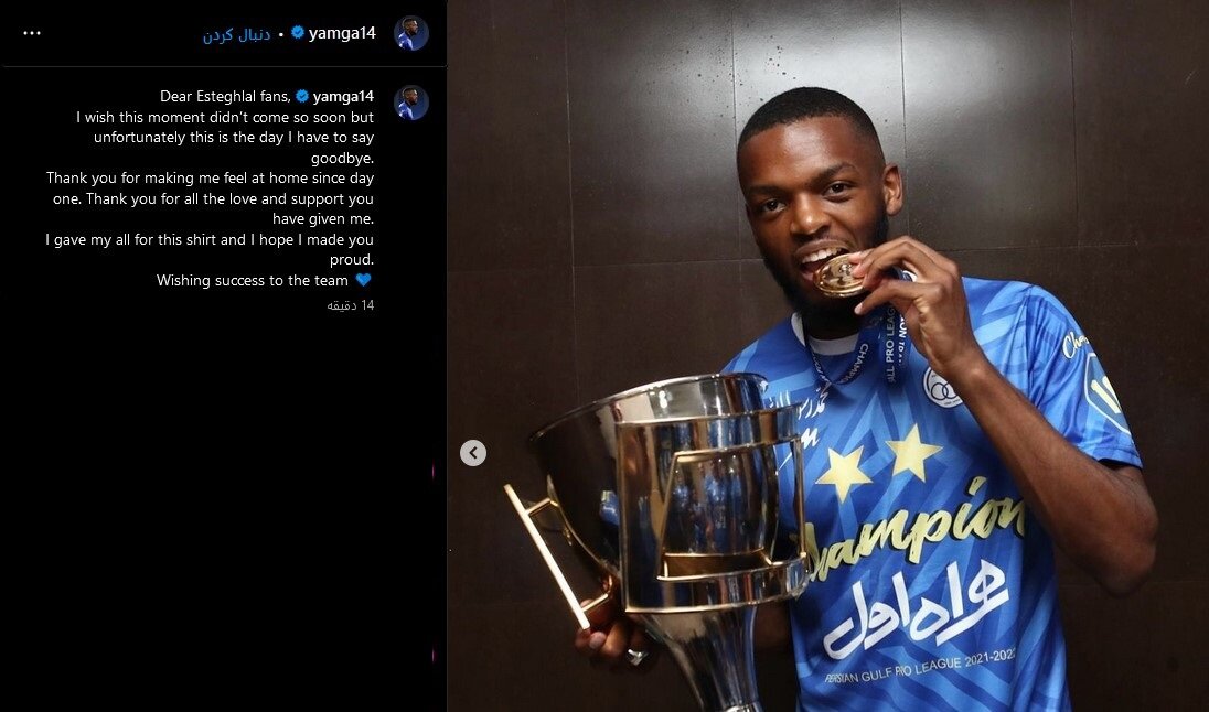 کوین یامگا مدافع تیم فوتبال استقلال تهران با انتشار پستی در فضای مجازی از این باشگاه خداحافظی کرد.