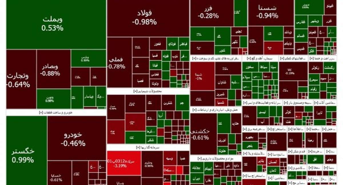 فولاد، فملی و شستا به ترتیب از نمادهای تاثیرگذار بر شاخص بورس بودند که همگی قرمز شدند. از نمادهای پرتراکنش نیز میتوان به وبملت، فولاد و خگستر اشاره کرد.