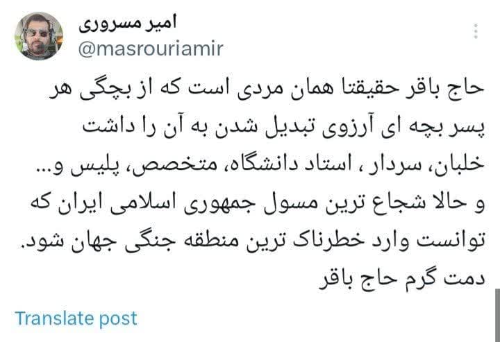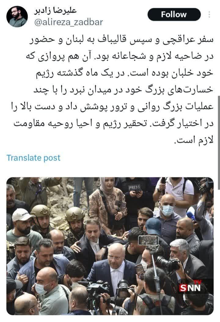 صبح امروز رئیس مجلس عازم بیروت شد و هدایت هواپیما هم خود به عهده گرفت. سپس با فرود هواپیما در فضای جنگی لبنان و بمباران اطراف فرودگاه، به ضاحیه و خرابههای ناشی از جنایات صهیونیستها رفت.