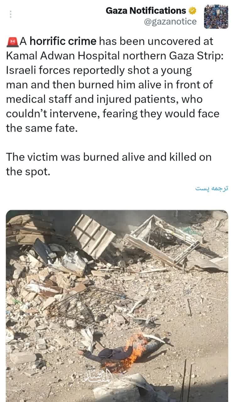 بنا بر گزارشها نیروهای اسرائیلی مرد جوانی را در مقابل چشمان کادر پزشکی و مجروحان زنده زنده سوزانده شد. کادر درمان از ترس اینکه به سرنوشت مشابهی دچار شوند نتوانستند مداخله کنند و جوان زنده زنده سوزانده و در دم کشته شد.