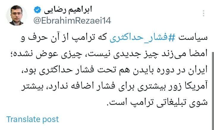 سیاست فشار حداکثری که ترامپ از آن حرف می زند چیز جدیدی نیست، چیزی عوض نشده؛ ایران در دوره بایدن هم تحت فشار حداکثری بود.