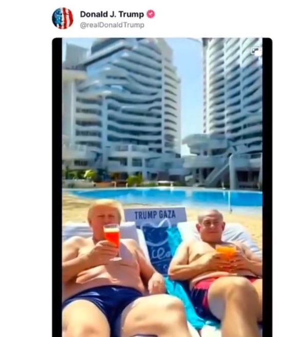 رئیس‌جمهور آمریکا که از ابتدای آغاز به کارش در حال حمایت‌های همه‌جانبه از اسرائیل است، فیلمی در شبکه «تروث سوشال» منتشر کرد که در آن او و بنیامین نتانیاهو در حال استراحت در ساحل غزه هستند.