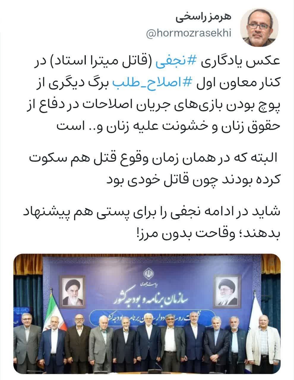 یک کاربر ویراستی، پستی در‌باره دوباره دیده شدن محمدعلی نجفی قاتل میترا استاد در جلسه مدیران ادوار سازمان برنامه و بودجه و عکس یادگاری کنار معاون اول اصلاح طلب منتشر کرد.