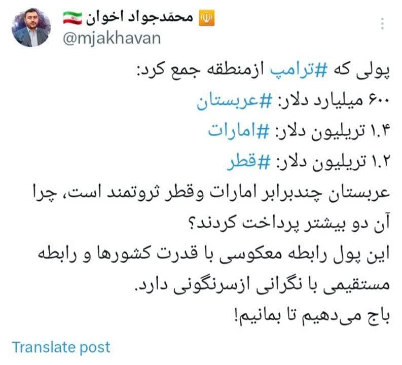 محمد جواد اخوان در صفحه شخصی خود در ایکس به پولی که ترامپ از منطقه جمع کرد اشاره کرده است.