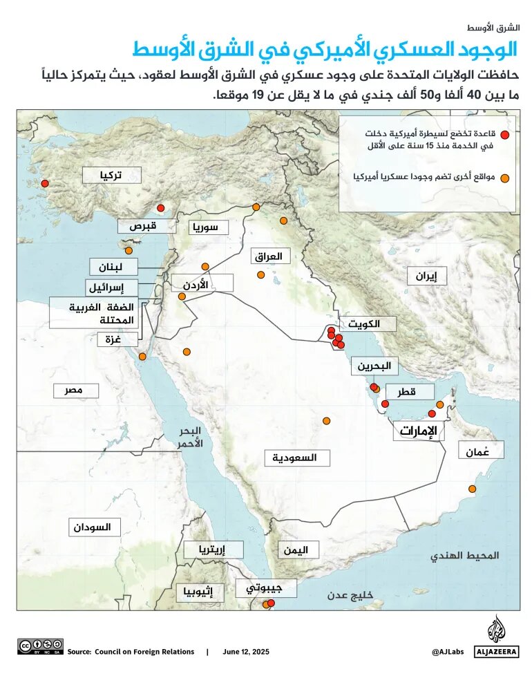 به گزارش جهان نیوز به نقل از مهر، پایگاه خبری الجزیره در گزارشی با اشاره به حضور پایگاههای آمریکا در منطقه به عنوان اهدافی مشروع برای واکنش ایران به حمله هوایی آمریکا به سایتهای هستهای جمهوری اسلامی، نوشت که آمریکاییها بعد از حمله رژیم صهیونیستی به ایران موجودیت نظامی خود در منطقه را تقویت کردند.