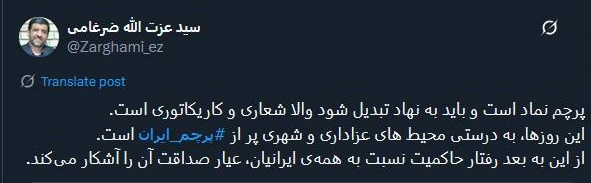 عزت الله ضرغامی در توئیتی نوشت: پرچم نماد است و باید به نهاد تبدیل شود والا شعاری و کاریکاتوری است.