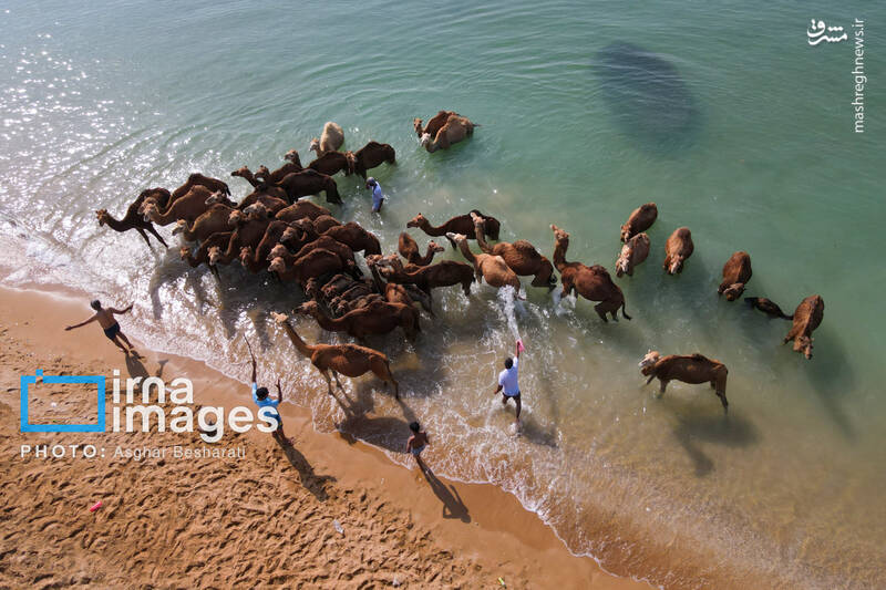 شستوشوی شترها با آب دریا در روستای سهیلی جزیره قشم یکی از رسوم دیرینه مردم جامعه محلی در روزهای گرم تابستان است که دامداران برای پاکسازی، خنک شدن و رفع گرمازدگی شترها آنها را به ساحل این روستا در کنار آبهای خلیجفارس میبرند.