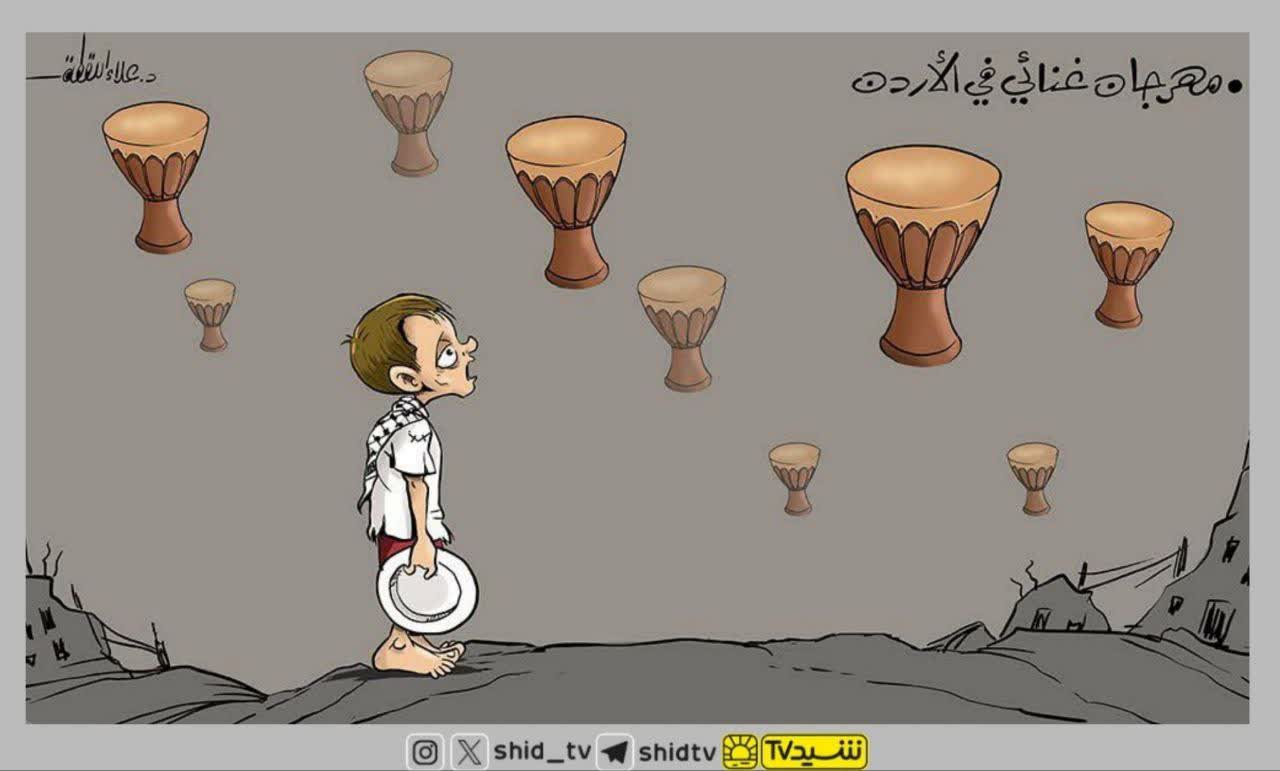 طعنه کاریکاتوریست فلسطینی به برگزاری جشنواره موسیقی در اردن همزمان با آتش و گرسنگی در غزه!
