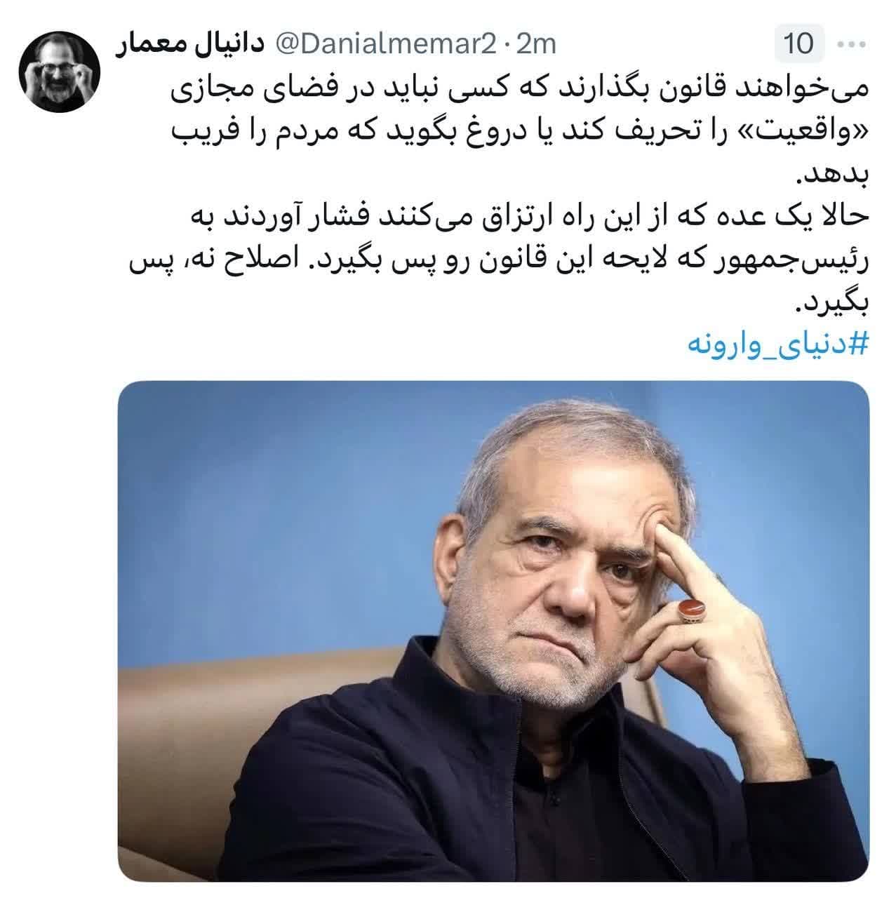 دانیال معمار در صفحه شخصی خود در ایکس نوشت: می خواهند قانون بگذارند که کسی نباید در فضای مازی واقعیت را تحریف کند یا دروغ بگوید که مردم را فریب بدهد.