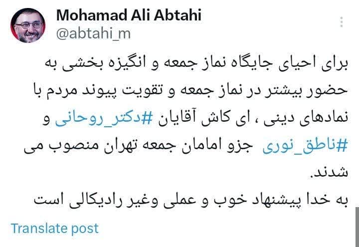 ابطحی در صفحه شخصی خود در ایکس نوشت: برای احیای جایگاه نماز جمعه و انگیزه بخشی به حضور بیشتر در نماز جمعه و تقویت پیوند مردم با نمادهای دینی، ای کاش آقایان دکتر روحانی و ناطق نوری جزو امامان جمعه تهران منصوب می شدند.