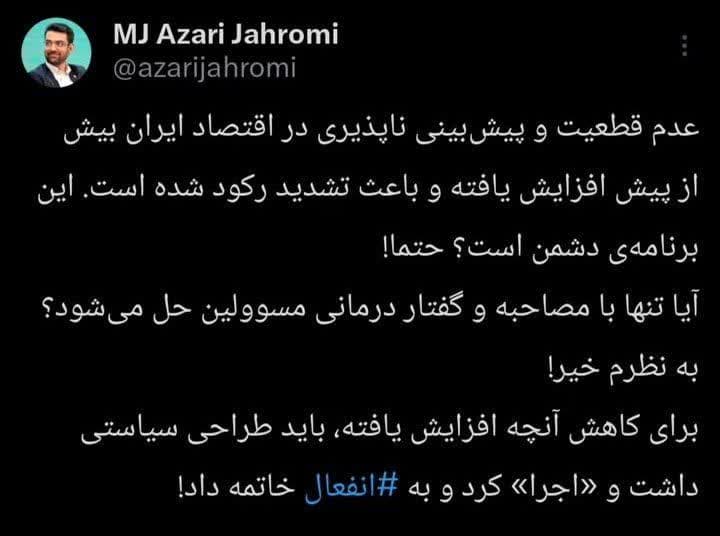 آذری جهرمی، عضو برجسته ستاد پزشکیان در صفحه شخصی خود در ایکس نوشت: برای آنچه باعث تشدید رکود شده است باید طراحی سیاستی داشت و اجرا کرد و به انفعال خاتمه داد.