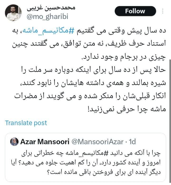ده سال پیش وقتی می گفتیم مکانیسم ماشه می گفتند چنین چیزی در برجام وجود ندارد حالا پس از ده سال انکار قبلی خود را منکر شده و می گویند از مضرات ماشه چرا حرفی نمی زنید.