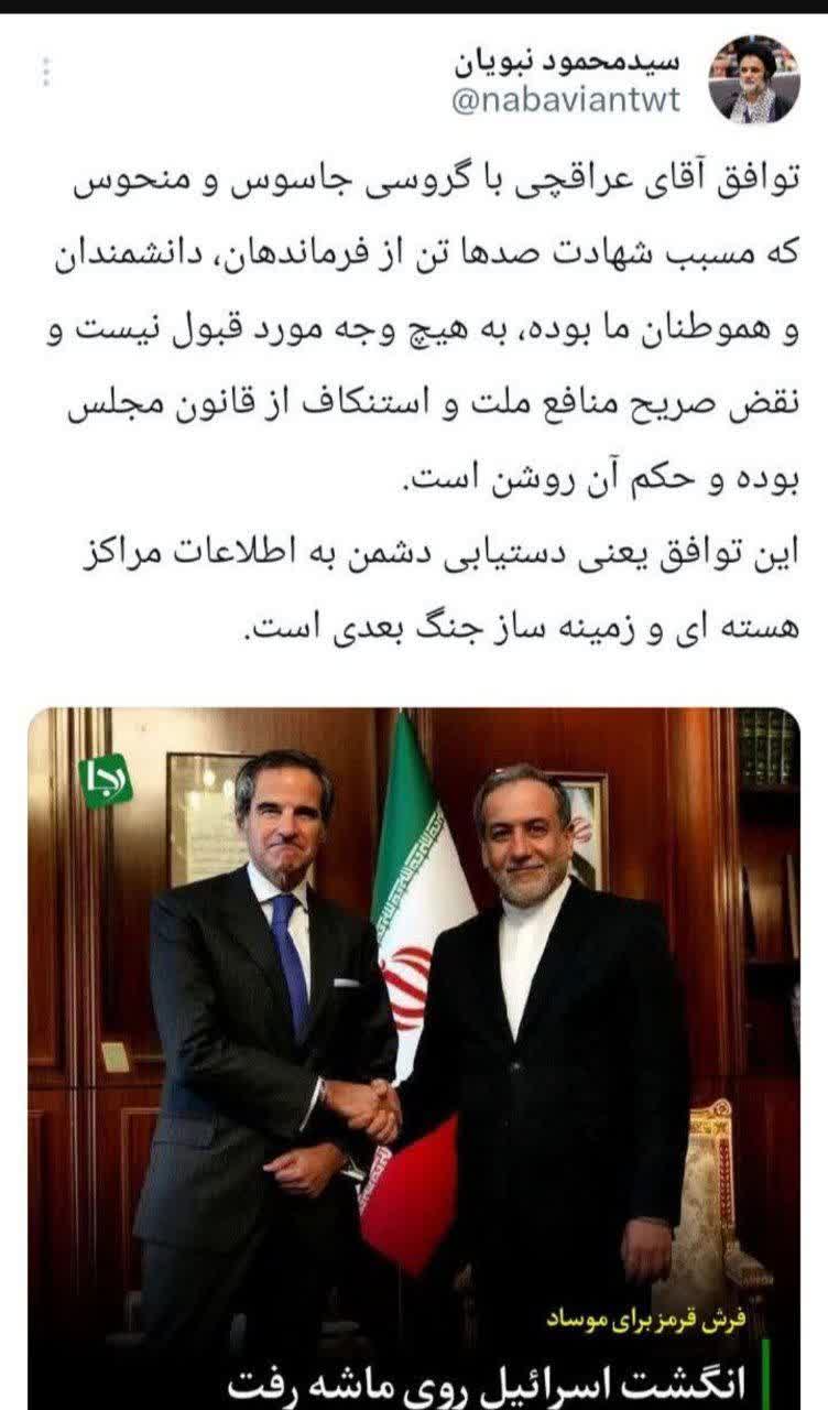 نبویان، عضو کمیسیون امنیت ملی مجلس در صفحه شخصی خود در ایکس نوشت: توافق آقای عراقچی با گروسی جاسوس و منحوس که مسبب شهادت صدها تن از فرماندهان، دانشمندان و هموطنان ما بوده، به هیچ وجه مورد قبول نیست