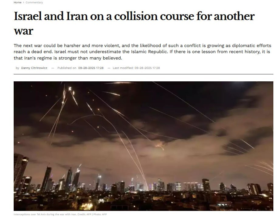 اسرائیل هیوم در یادداشتی با تیتر «اسرائیل و ایران در مسیر برخورد برای جنگی دیگر!» نوشت: جنگ بعدی می‌تواند سخت‌تر و خونین‌تر باشد و احتمال وقوع آن با به بن‌بست رسیدن تلاش‌های دیپلماتیک در حال افزایش است.
