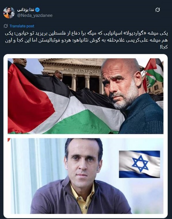 یکی میشه «گواردیولا» اسپانیایی که میگه برا دفاع از فلسطین بریزید تو خیابون؛ یکی هم میشه علیکریمی غلامحلقه به گوش نتانیاهو؛ هردو فوتبالیستن اما این کجا و اون کجا!