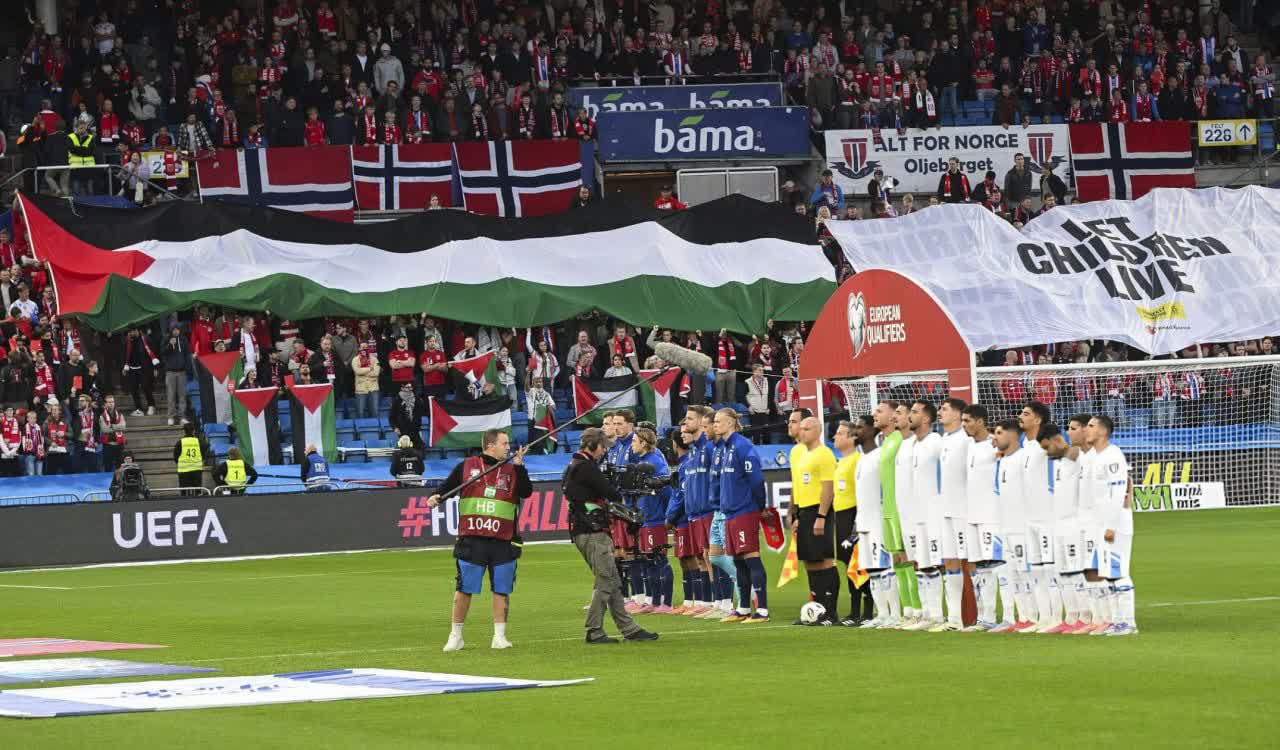 هواداران نروژ، در اعتراض به حضور تیم رژیم صهیونیستی در کشورشان، در ورزشگاه پرچم فلسطین را برافراشتند.