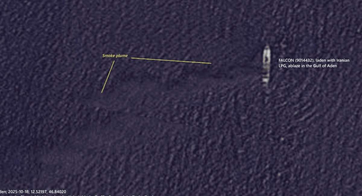 بر اساس اعلام aspides در ۱۸ اکتبر ساعت ۷:۰۰ به وقت جهانی، کشتی «ام‌وی فالکون» با پرچم کامرون که در ۱۱۳ مایل دریایی جنوب شرقی بندر عدن، یمن، به مقصد جیبوتی در حرکت بود، پس از انفجاری در داخل کشتی، آتش گرفت و سرگردان شد. علت انفجار در حال حاضر مشخص نیست. نشانه‌های اولیه نشان می‌دهد که ۱۵ درصد از کشتی در آتش سوخته است و آتش‌سوزی ناشی از یک حادثه بوده است.