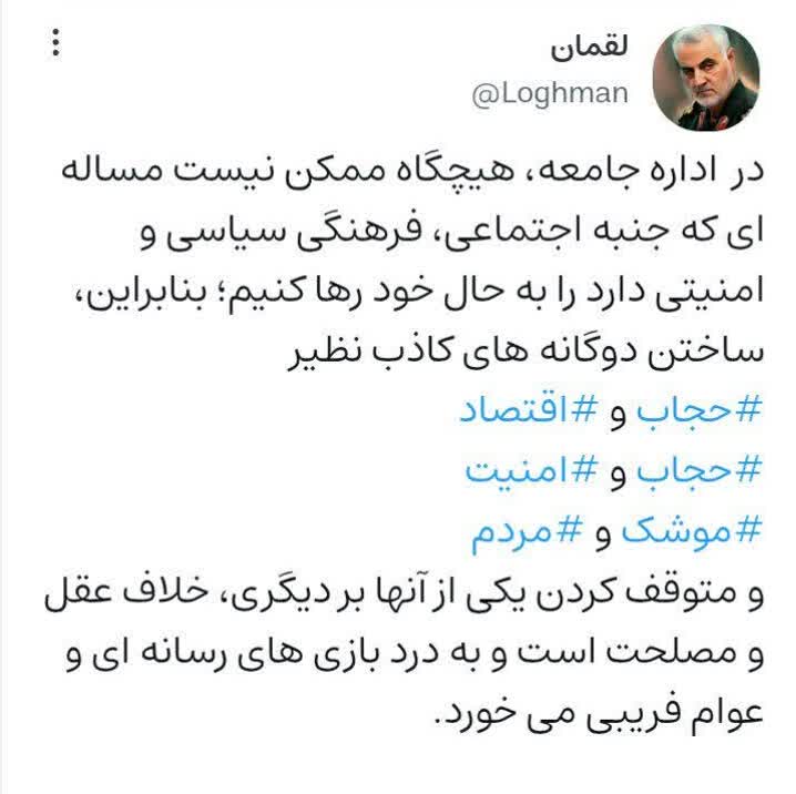 ساختن دوگانه کاذب نظیر حجاب و اقتصاد، حجاب و امنیت، موشک و مردم و متوقف کردن یکی از آن ها بر دیگری، خلاف عقل و مصلحت است.