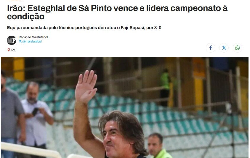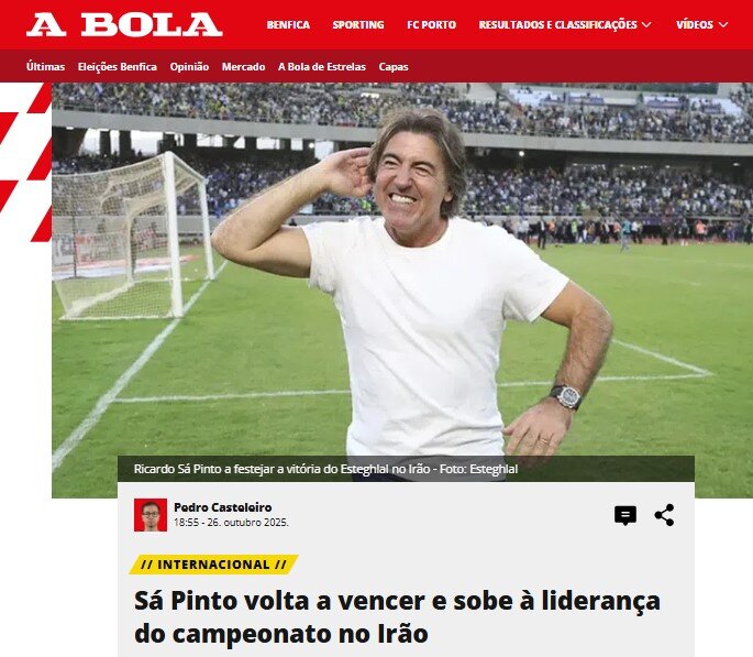 سایت «maisfutebol» نوشت: تیم استقلال ایران به هدایت ریکاردو سا پینتو موفق شد با نتیجه ۳ بر صفر فجرسپاسی را شکست دهد و به طور موقت صدرنشین لیگ برتر ایران شود. با این پیروزی، شاگردان سا پینتو با ۱۳ امتیاز به صدر جدول لیگ برتر صعود کردند، هرچند در امتیاز با آلومینیوم اراک برابر هستند. تیمهای تراکتور و ملوان نیز تنها یک امتیاز کمتر از استقلال دارند و هنوز بازیهای خود در هفته هشتم را انجام ندادهاند؛ بنابراین در صورت پیروزی هر یک از آنها، استقلال ممکن است صدر جدول را از دست بدهد.