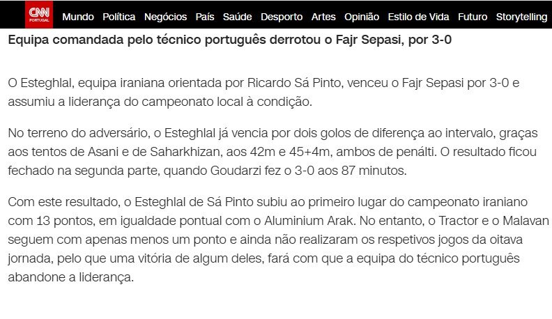 پس از برتری تیم فوتبال استقلال مقابل فجرسپاسی و صدرنشینی در لیگ برتر، رسانه های پرتغالی این موضوع را بازتاب کردند.