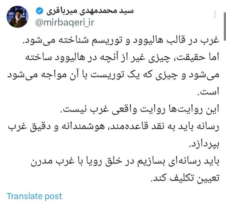آیت الله میرباقری در صفحه شخصی خود در ایکس نوشت: غرب خودش را در قالب توریسم و هالیوود می‌شناساند اما حقیقت این نیست.