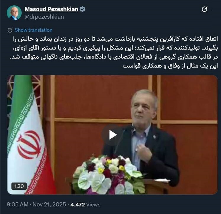 پزشکیان رئیس جمهور در توئیتر نوشت: اتفاق افتاده که کارآفرین پنجشنبه بازداشت می‌شد تا دو روز در زندان بماند و حالش را بگیرند. تولیدکننده که فرار نمی‌کند! این مشکل را پیگیری کردیم و با دستور آقای اژه‌ای، در قالب همکاری گروهی از فعالان اقتصادی با دادگاه‌ها، جلب‌های ناگهانی متوقف شد.
