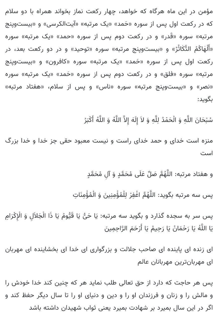 هر که نماز ماه جمادی الثانی را بخواند خدا خودش، مالش، زنان، فرزندان او، دین و دنیای او را تا سال دیگر حفظ کند و اگر در این سال بمیرد بر شهادت بمیرد.