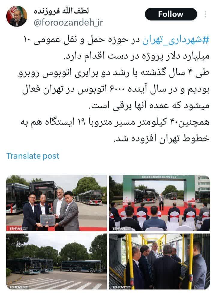 شهرداری تهران در حوزه حمل و نقل عمومی ۱۰ میلیارد دلار پروژه در دست اقدام دارد طی چهار سال گذشته با رشد دو برابری اتوبوس روبرو بودیم.